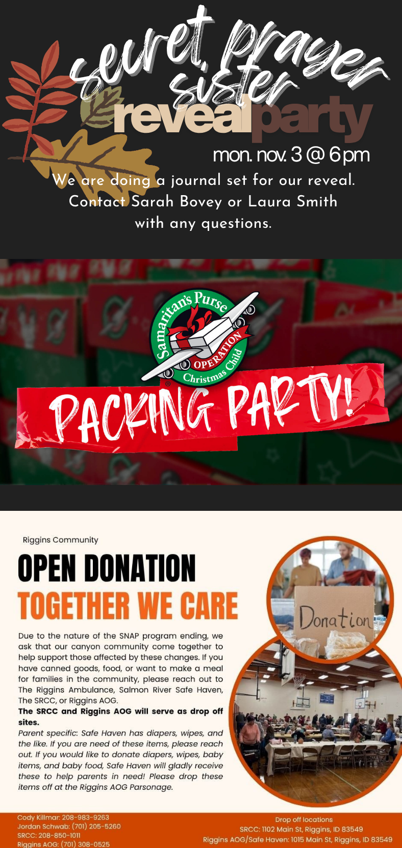 Nov 12 - Operation Christmas Child Shoebox Packing Party @ AOG: 6 pmYou can continue to bring in donations up to that time.
